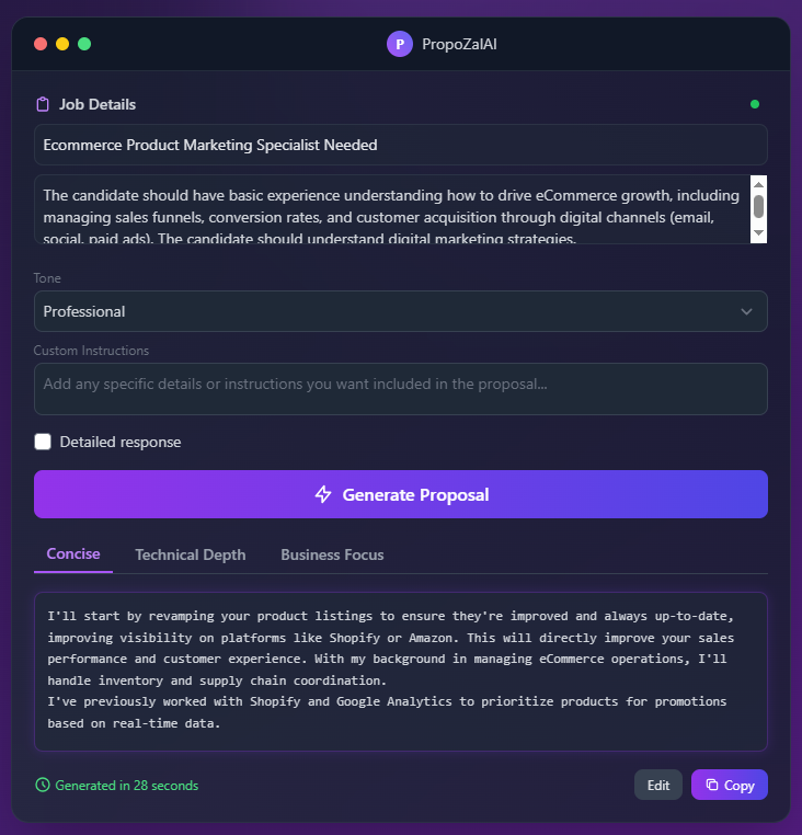 Our advanced AI is analyzing the job requirements and crafting a personalized proposal that highlights your relevant skills and experience.
